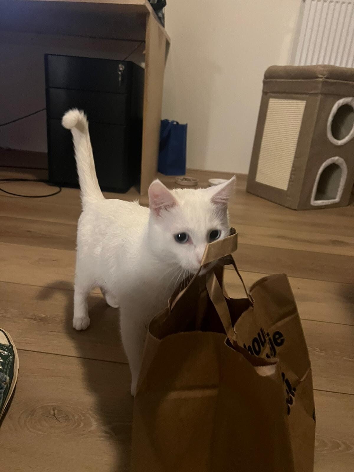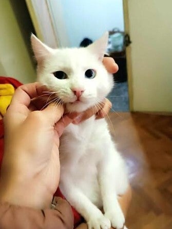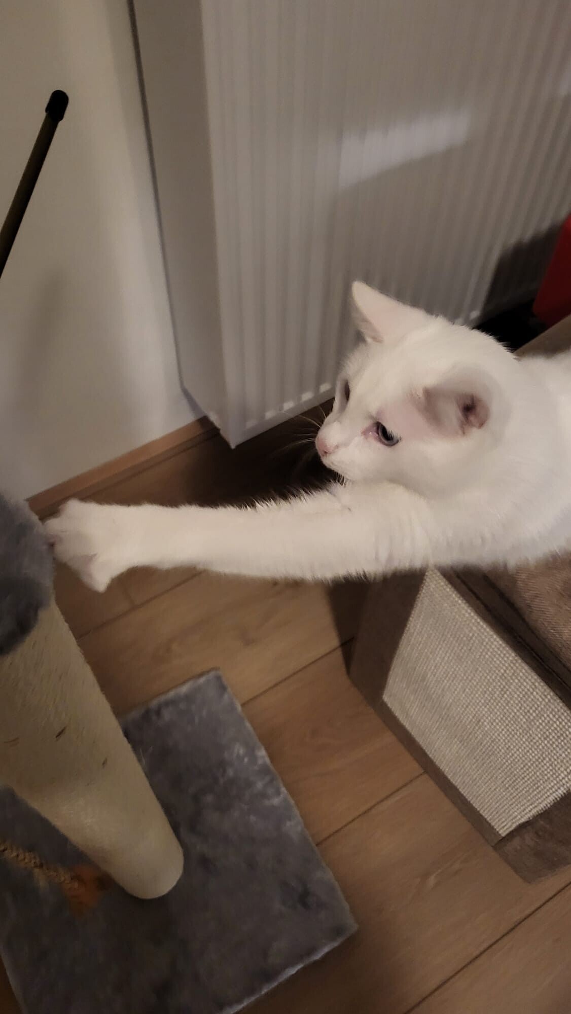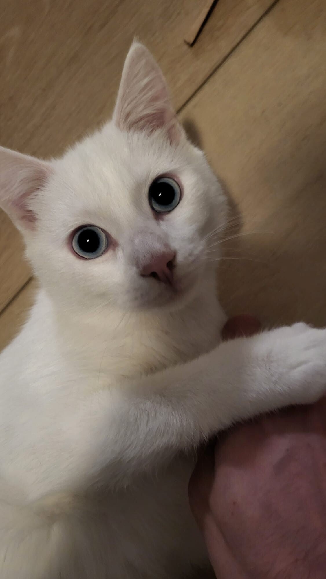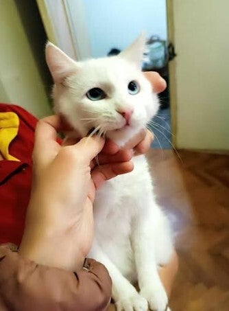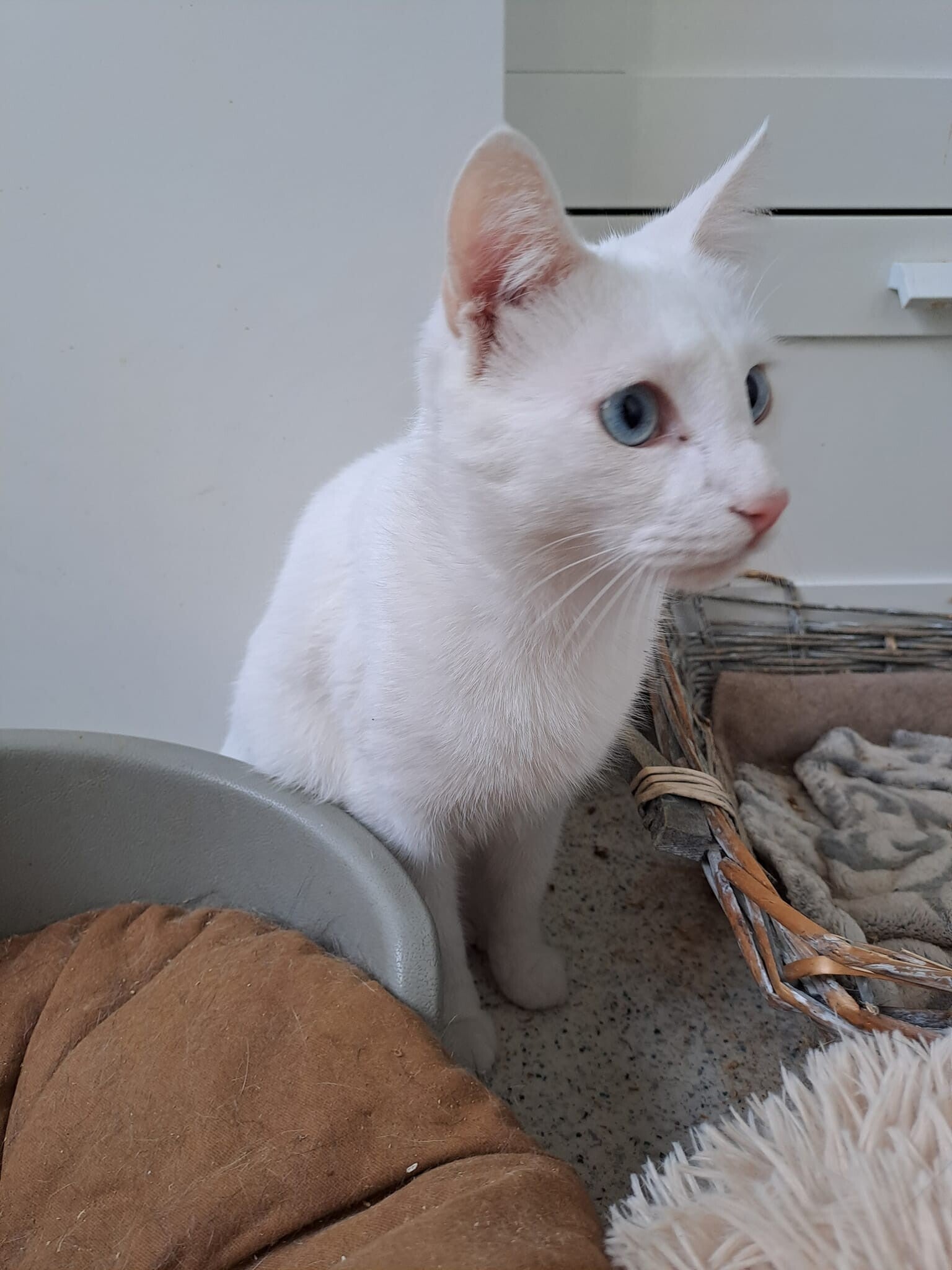 Te bezoeken in Nederland. Frosty is een prachtige sneeuwwitte kater met blauwe ogen. We krijgen niet de indruk dat hij doof is.